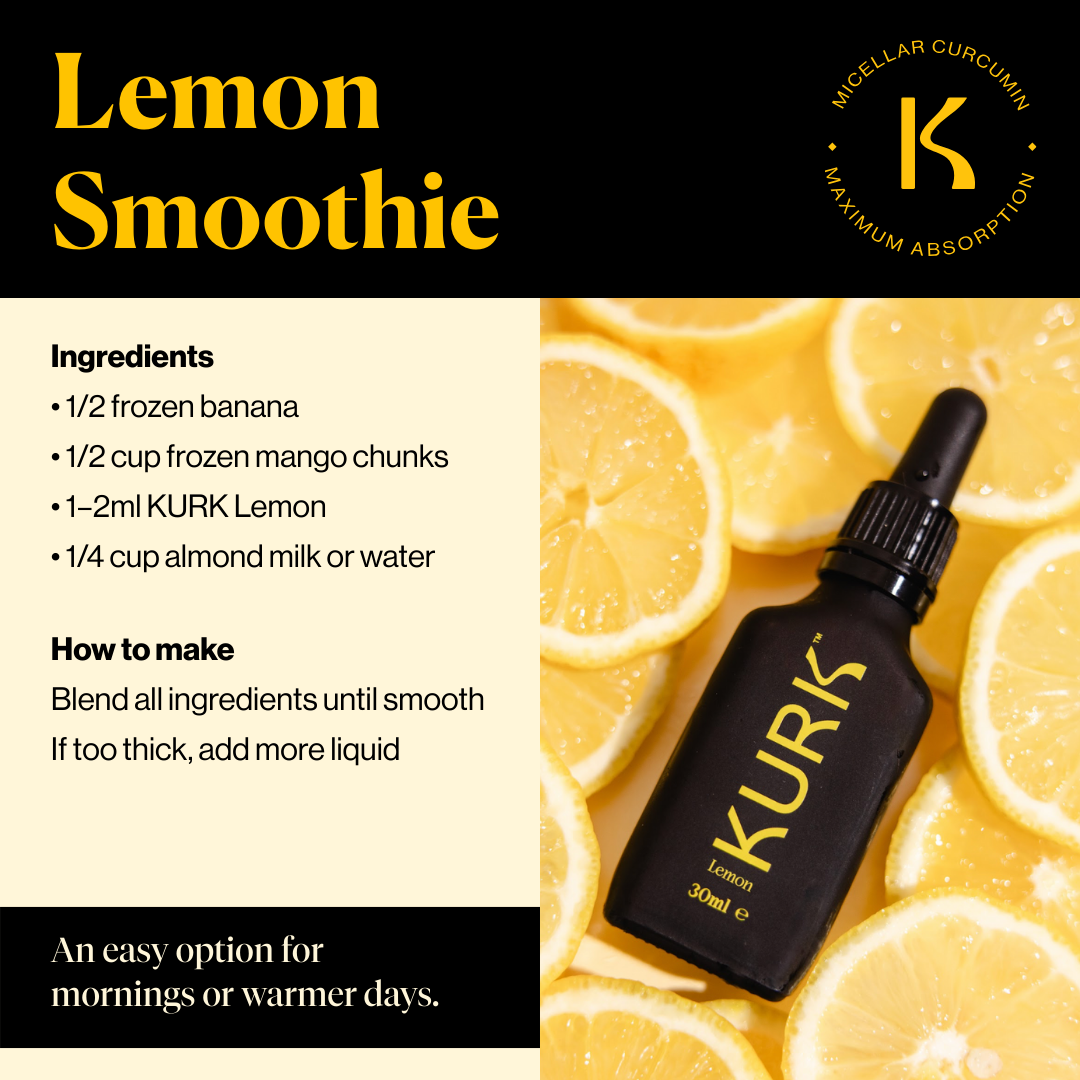 Add 1 ml to 200 ml of your favourite drink. The subtle lemon flavour works naturally with KURK’s curcumin, making it simple to take every day. Mix into sparkling water, oat milk lattes, smoothies or iced herbal teas.
